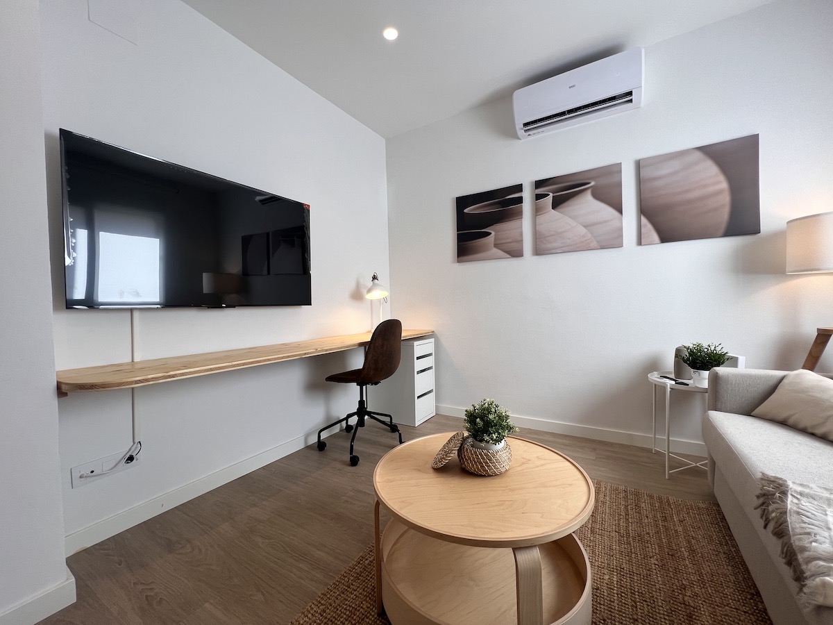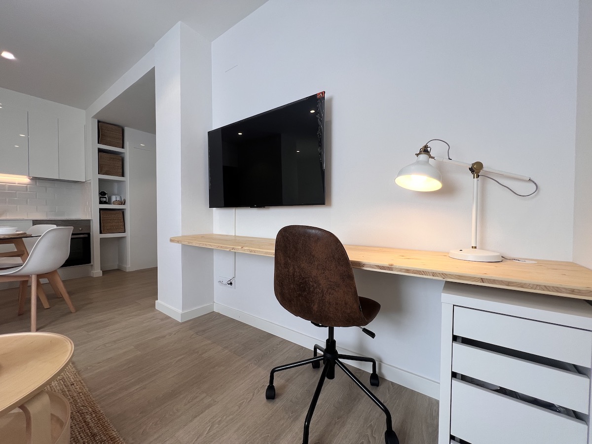 La dotamos de mobiliario de estilo moderno y actual, aportando frescura y funcionalidad a los espacios. Para la zona de teletrabajo, instalamos un amplio tablón de madera bajo el televisor, ideal para que dos personas puedan trabajar cómodamente.