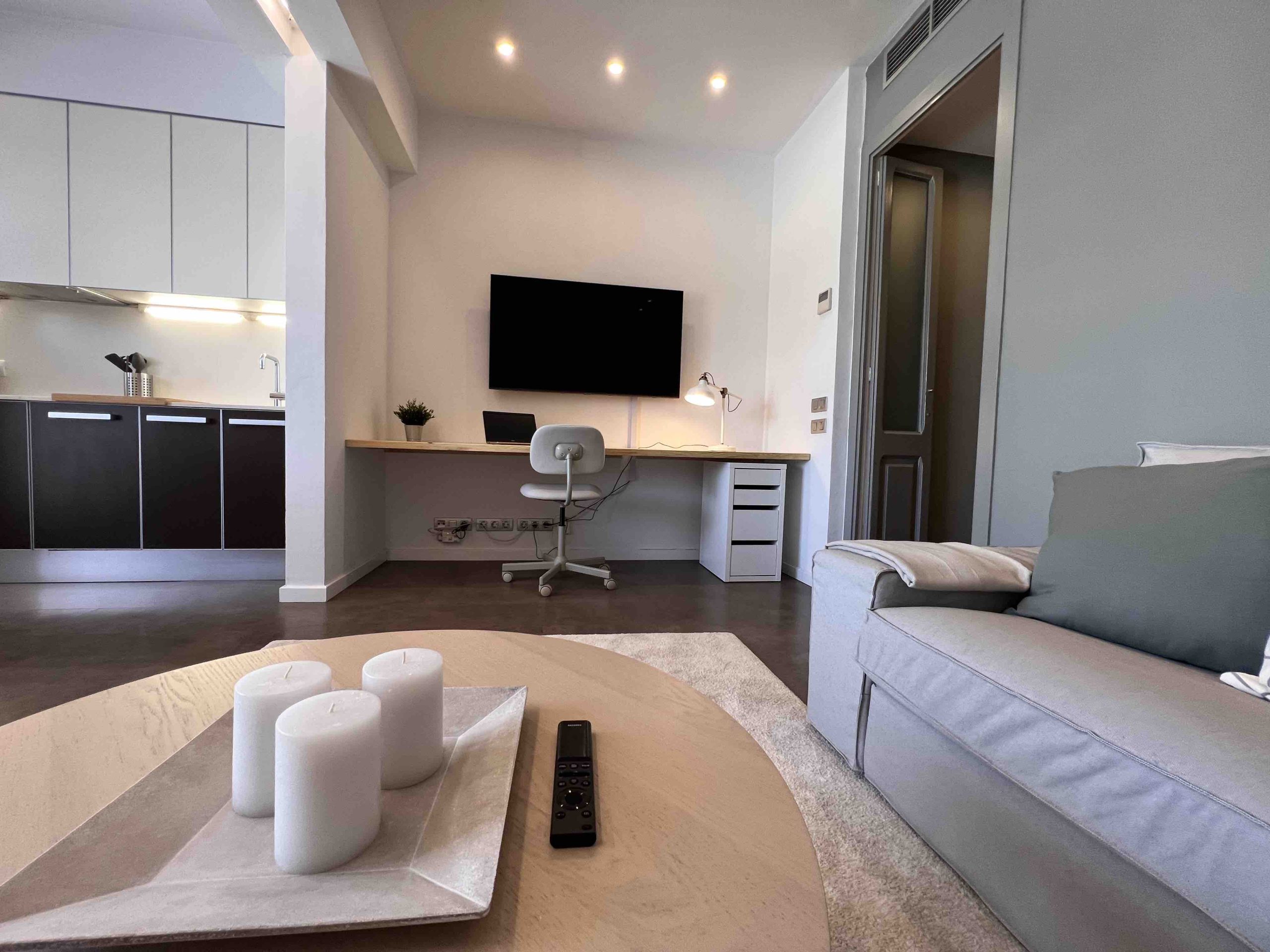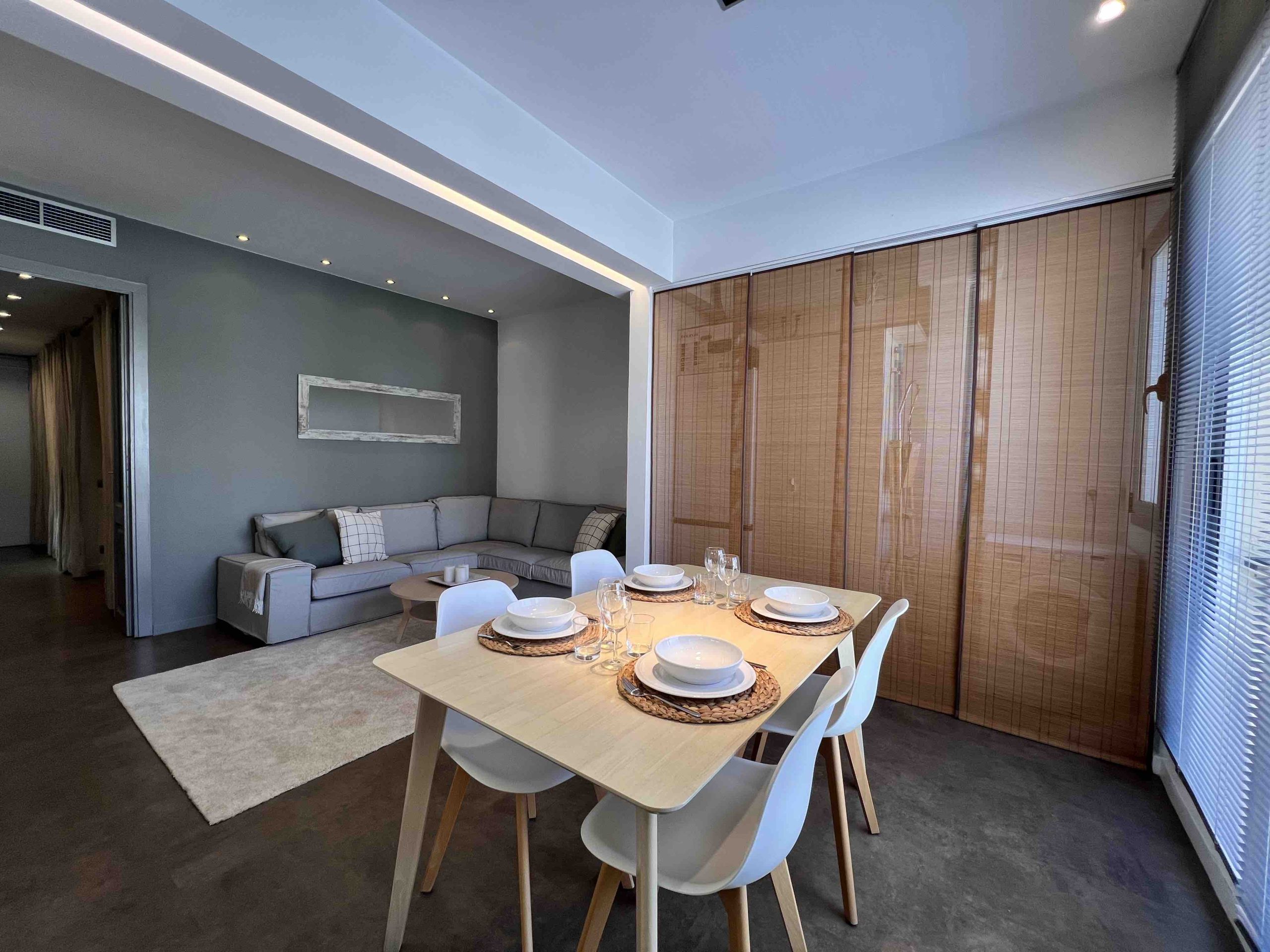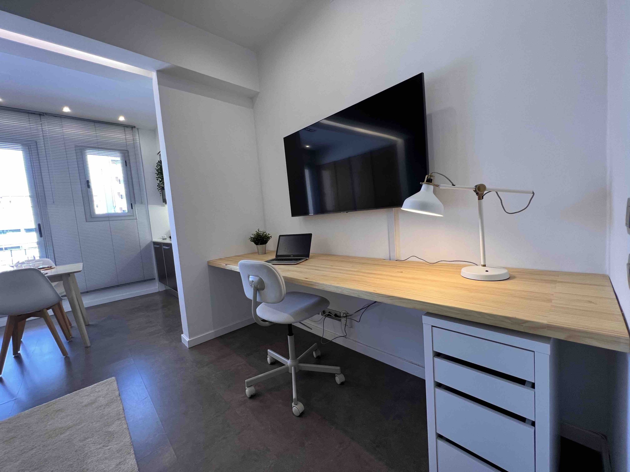 Amueblamos con un estilo moderno y actual, optimizando cada espacio. La zona de teletrabajo se resolvió con un práctico tablón de madera debajo de la televisión, maximizando la eficiencia del salón. En el dormitorio, eliminamos un armario que resultaba demasiado voluminoso, aprovechando el amplio frente de armarios ya existente en el pasillo. Además, revisamos todas las instalaciones para asegurar su buen funcionamiento.