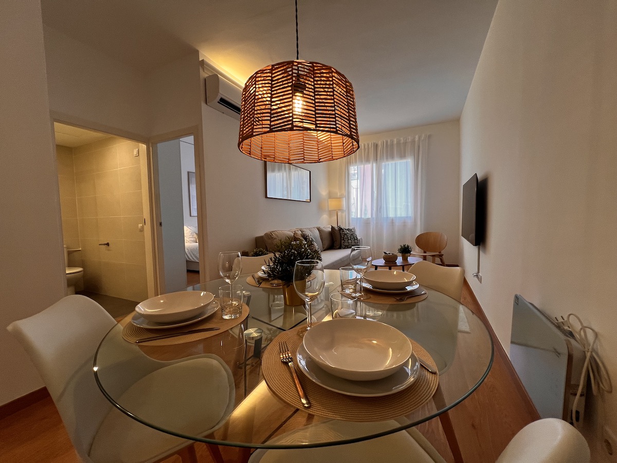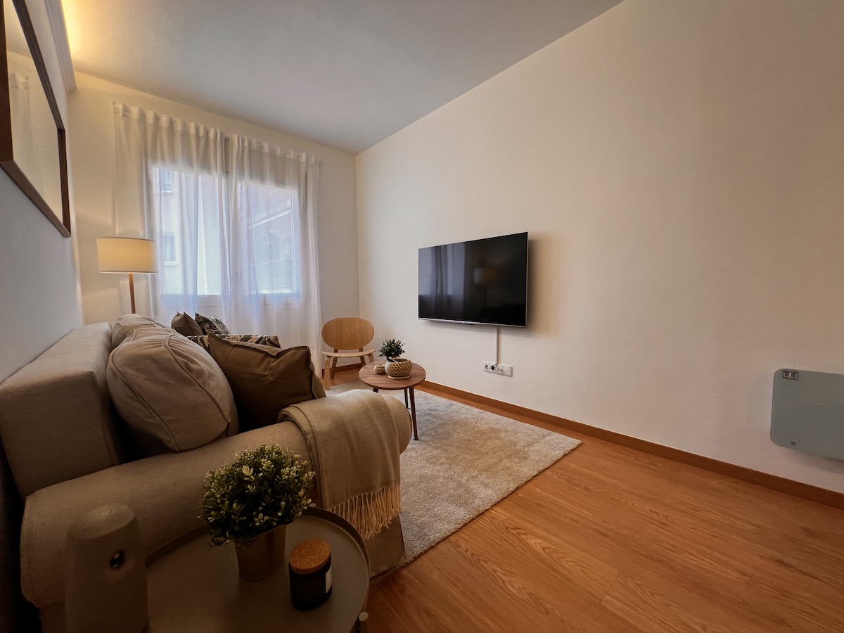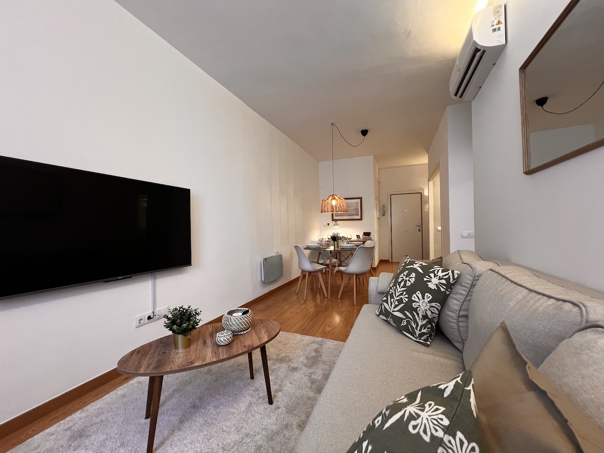 Amueblamos el espacio con un estilo moderno y actual. La zona de teletrabajo se resolvió con una elegante mesa de madera colocada en la entrada de la casa. En la cocina, instalamos una nueva encimera de madera y renovamos todos los electrodomésticos. El baño fue modernizado con un mueble contemporáneo y un espejo retroiluminado, mientras que se añadieron splits de aire acondicionado tanto en el salón como en el dormitorio.