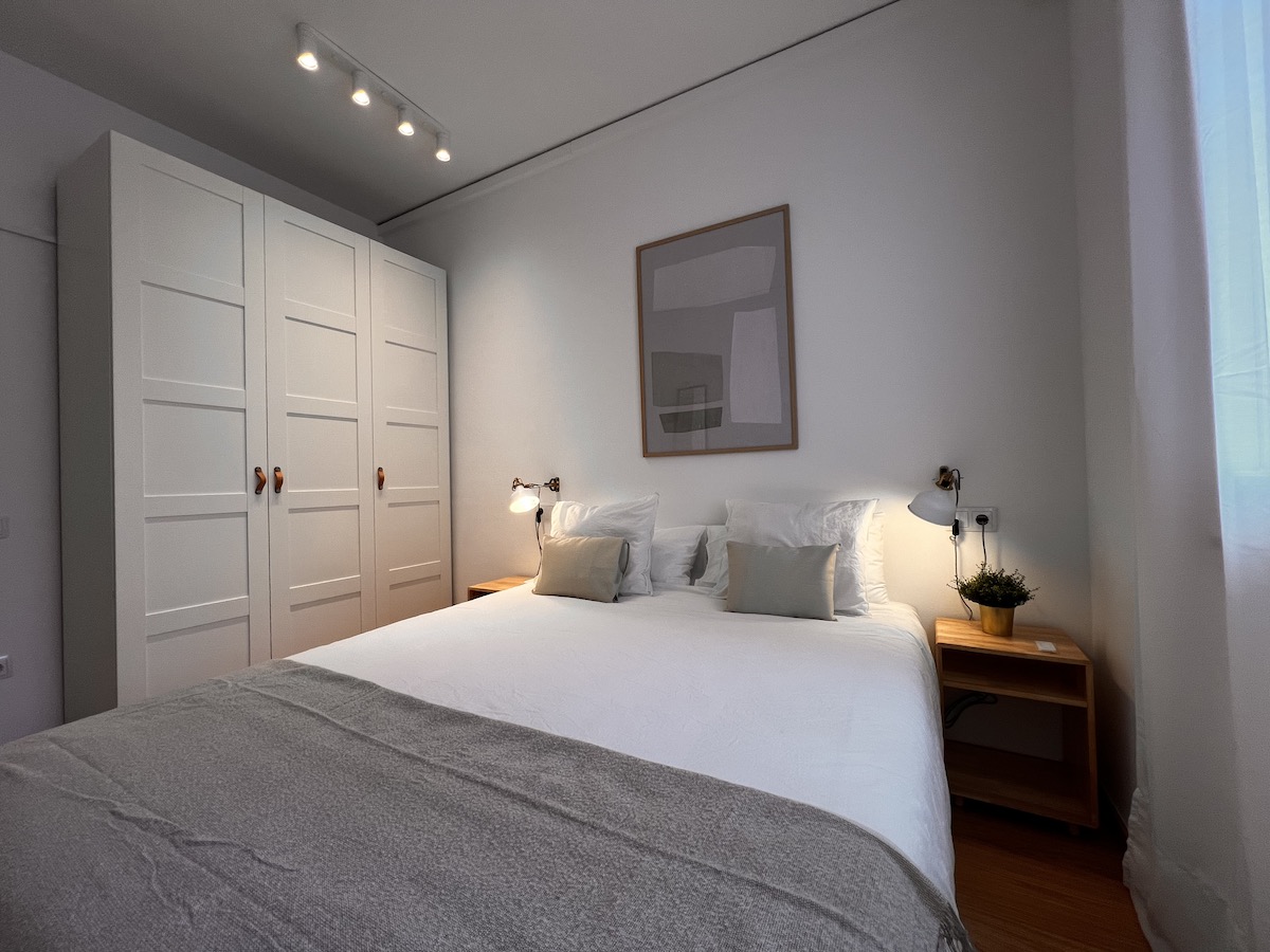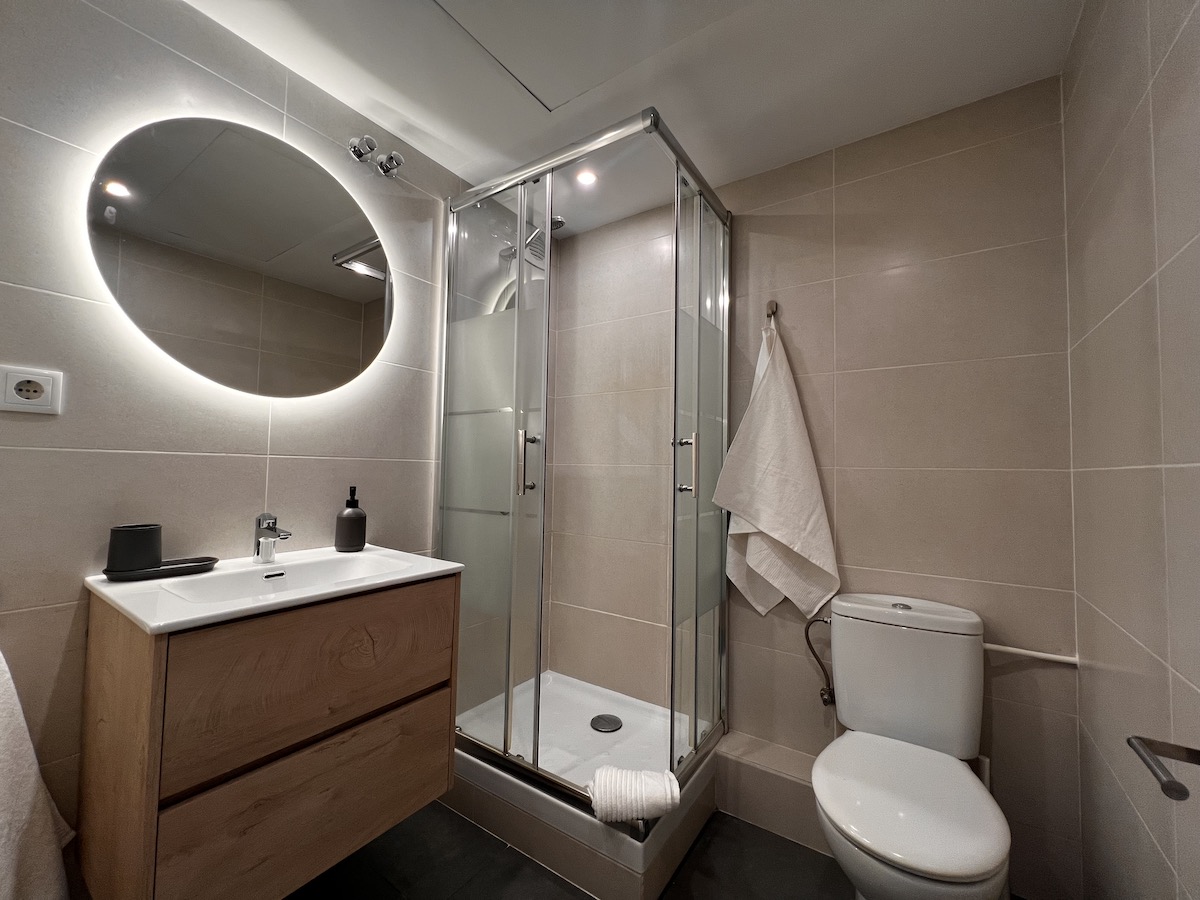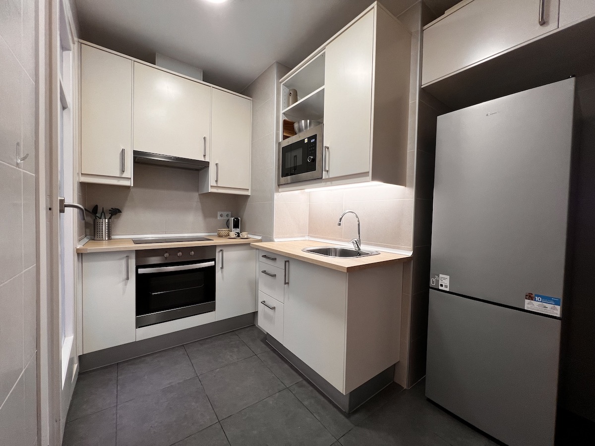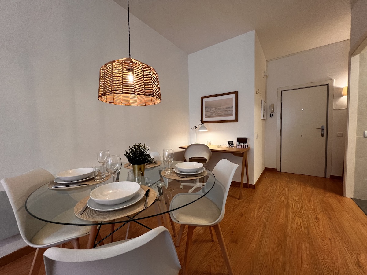 Amueblamos el espacio con un estilo moderno y actual. La zona de teletrabajo se resolvió con una elegante mesa de madera colocada en la entrada de la casa. En la cocina, instalamos una nueva encimera de madera y renovamos todos los electrodomésticos. El baño fue modernizado con un mueble contemporáneo y un espejo retroiluminado, mientras que se añadieron splits de aire acondicionado tanto en el salón como en el dormitorio.