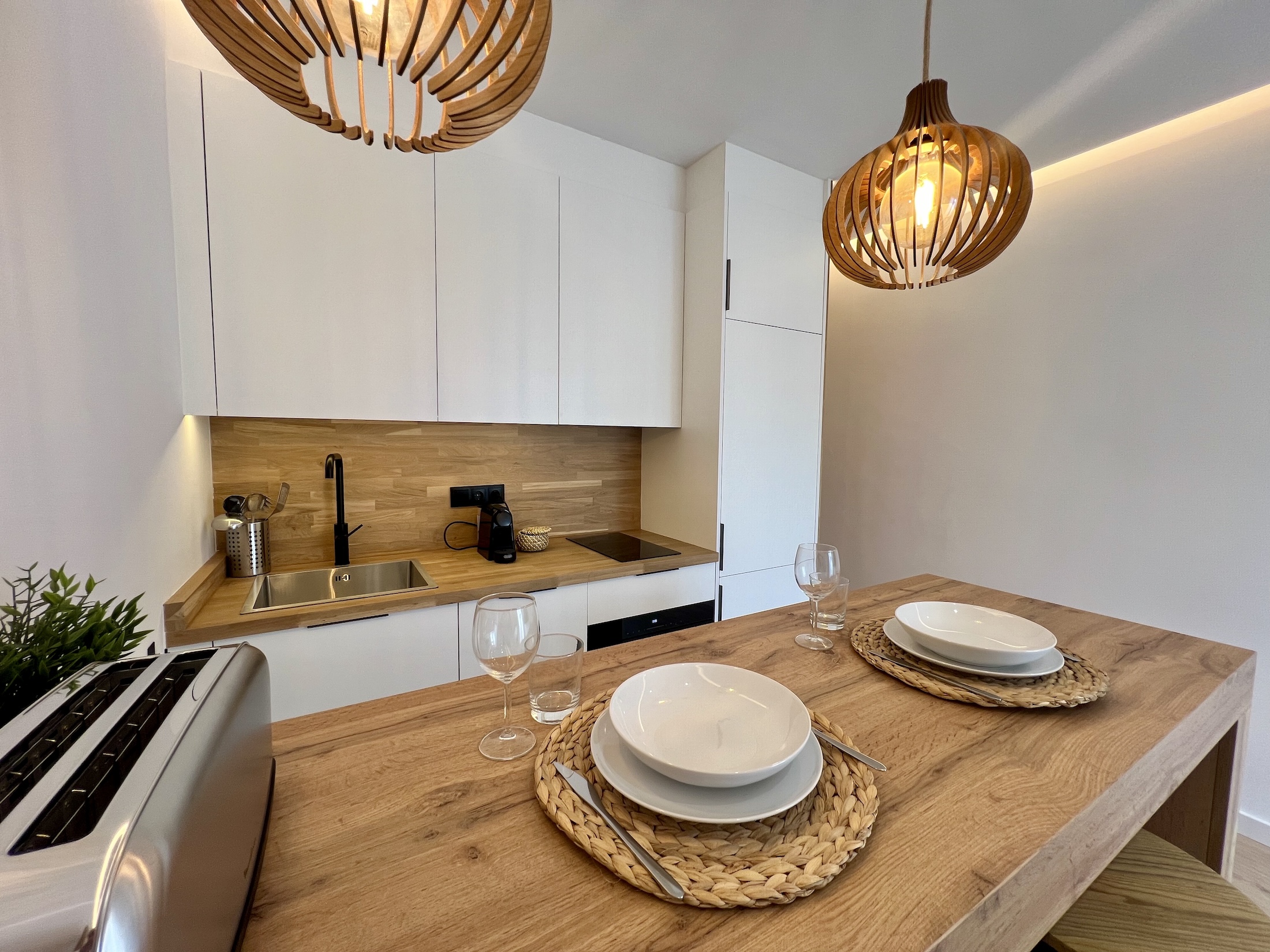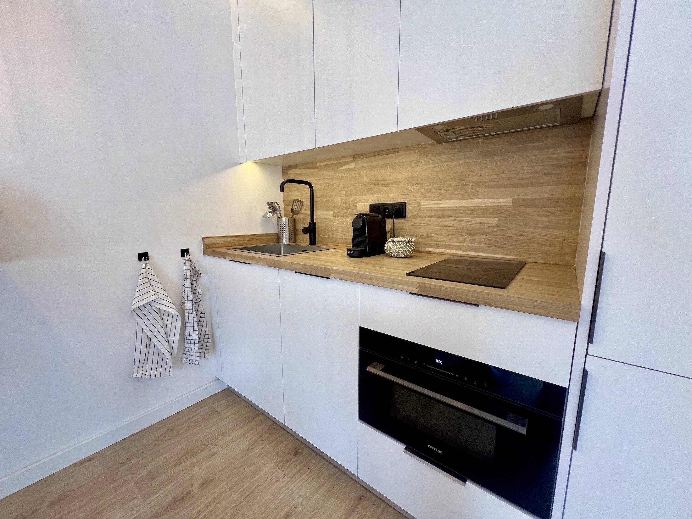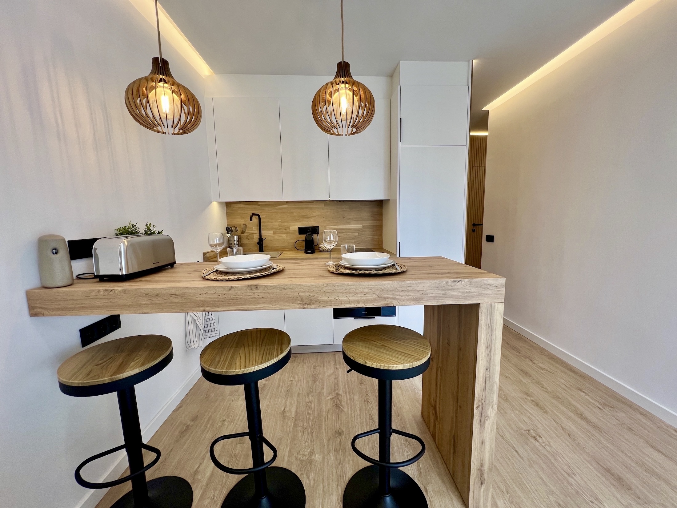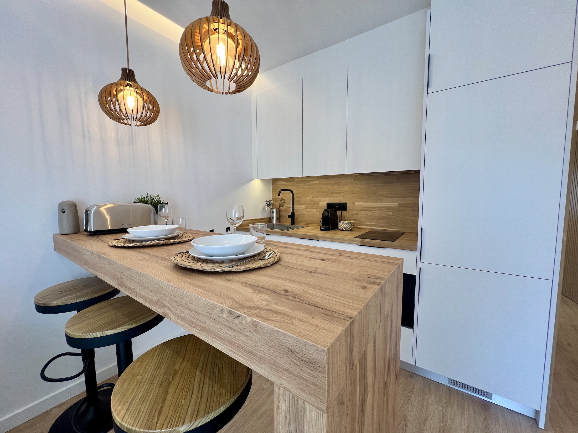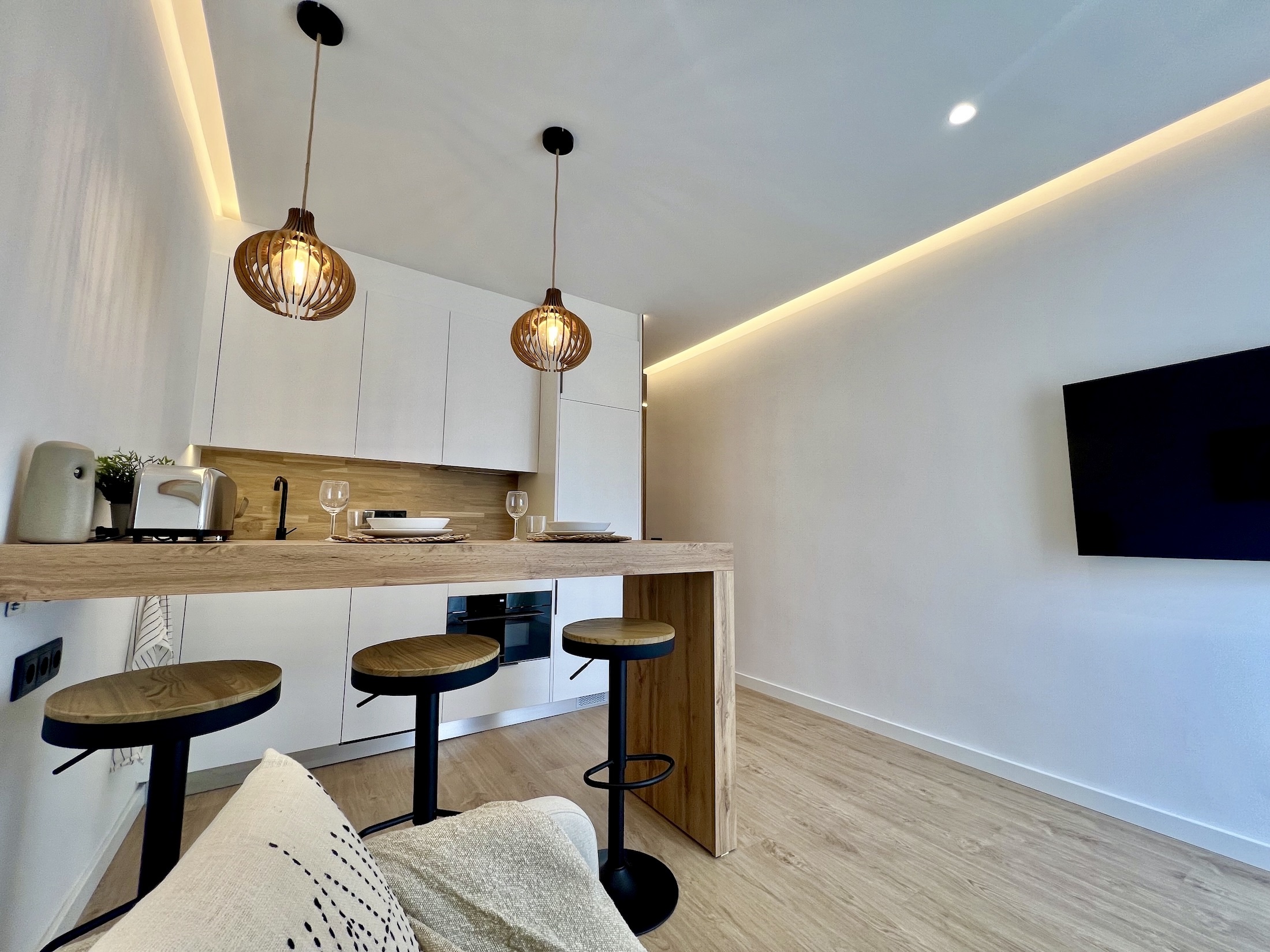 El recibidor y las puertas del baño y dormitorio se revestieron con paneles de palitería de madera sin tiradores, creando un efecto de puertas invisibles que aporta un toque singular y elegante al piso. En el salón, añadimos una atractiva barra americana de madera que sirve tanto como mesa de comedor como de teletrabajo, complementada por una cocina abierta con mobiliario blanco, electrodomésticos integrados y una encimera de madera con retorno frontal, a juego con la barra.