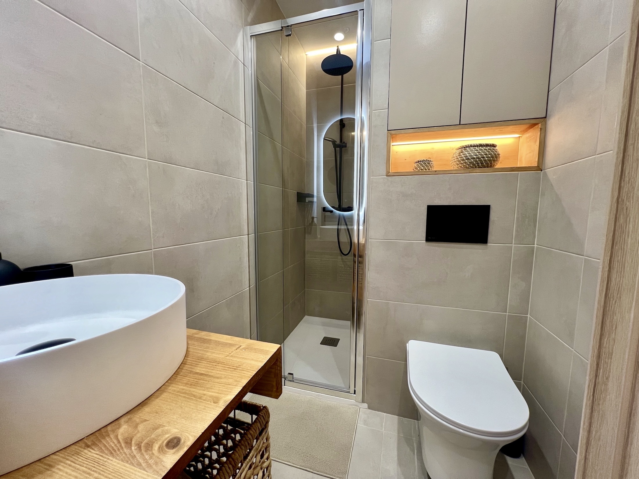 En el baño, instalamos un WC suspendido y grifería de color negro, a juego con los mecanismos eléctricos de toda la vivienda, aportando un estilo contemporáneo y cohesionado.