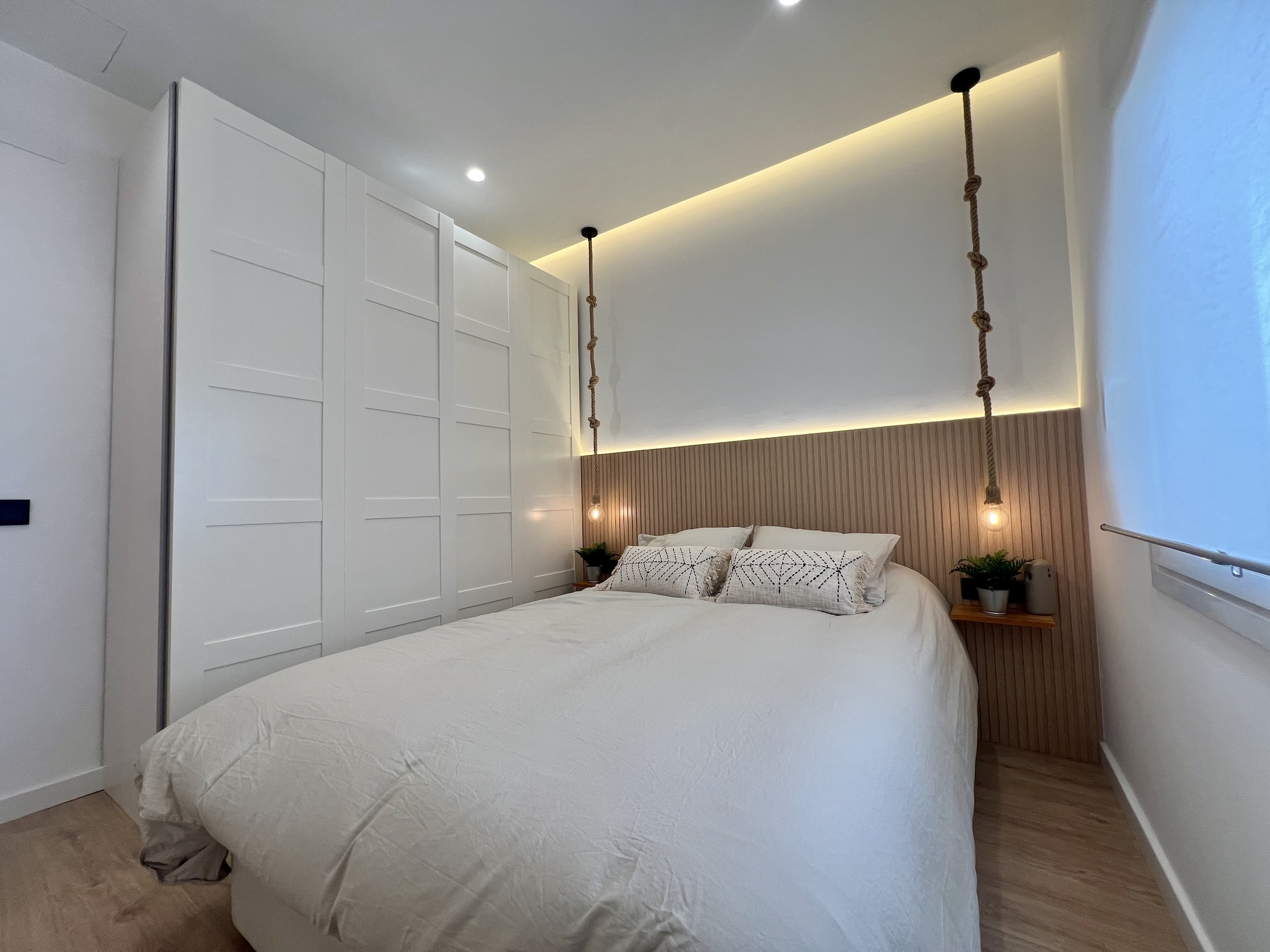 Bajamos todos los techos para ocultar las instalaciones y empotrar los focos, dejando los laterales con luz LED indirecta, lo que añade una atmósfera cálida y sofisticada.