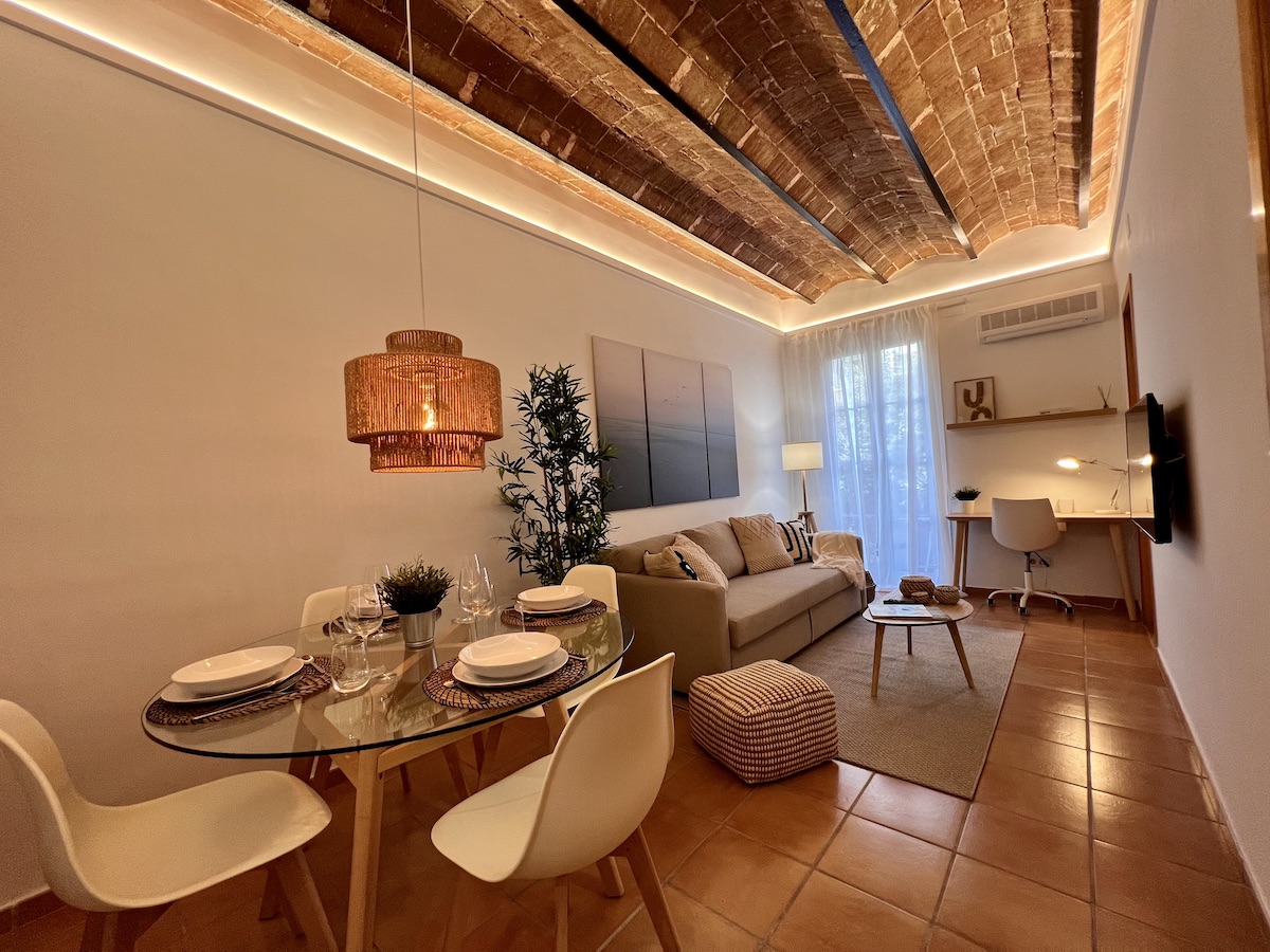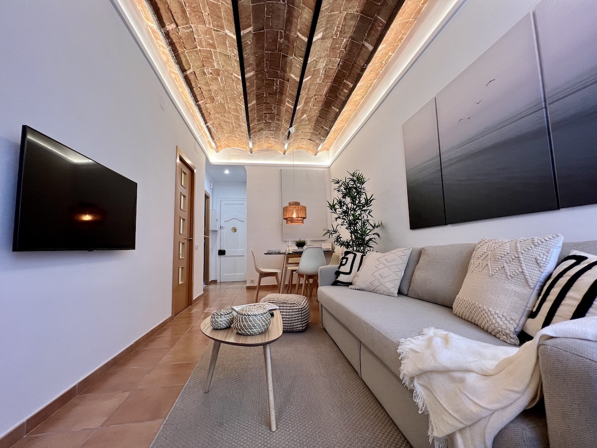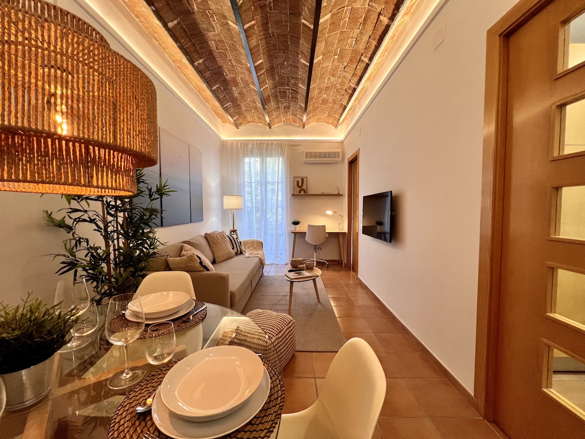 Durante la reforma, descubrimos la bóveda catalana original del techo, a la que añadimos una elegante iluminación perimetral tipo LED que realza el carácter del espacio. Además, creamos una zona de teletrabajo con una mesa de madera en el salón para mayor funcionalidad.