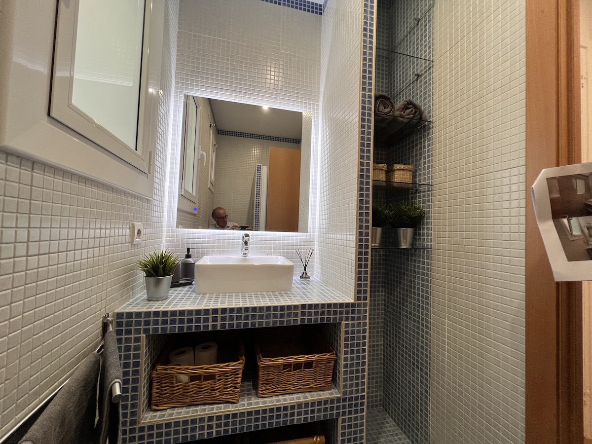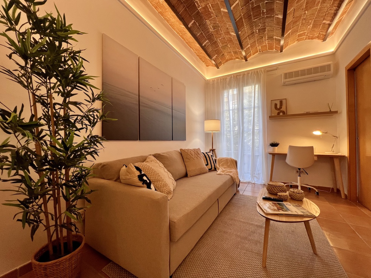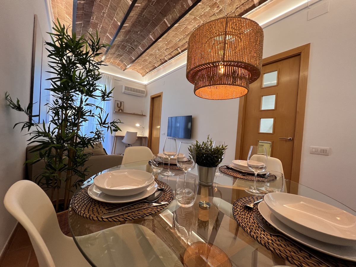 Durante la reforma, descubrimos la bóveda catalana original del techo, a la que añadimos una elegante iluminación perimetral tipo LED que realza el carácter del espacio. Además, creamos una zona de teletrabajo con una mesa de madera en el salón para mayor funcionalidad.